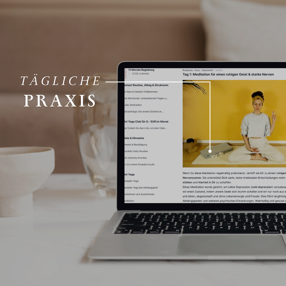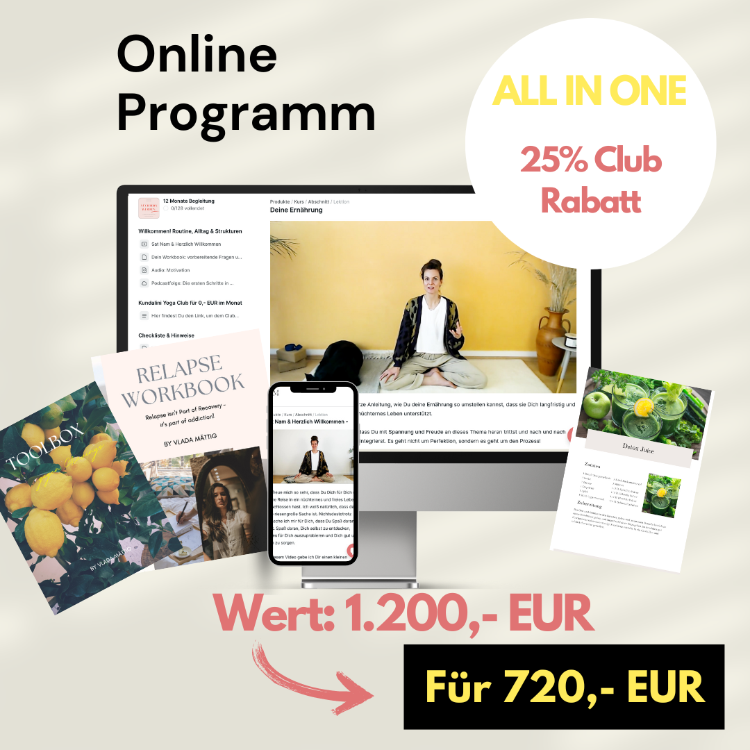 Im Online Programm erarbeitest Du Dir Schritt für Schritt Deinen individuellen Weg in ein nüchternes und selbstbestimmtes Leben. Du bestimmst das Tempo! Individuell und flexibel wirst Du Dir ein nüchternes Leben aufbauen und gestalten, in dem Du Dich sicher und zufrieden fühlst. Du erhältst einen 25% Rabatt auf den Kundalini Yoga Club & hast dadruch die Möglichkeit an den wöchentlichen Q&A Sessions teilzunehmen.